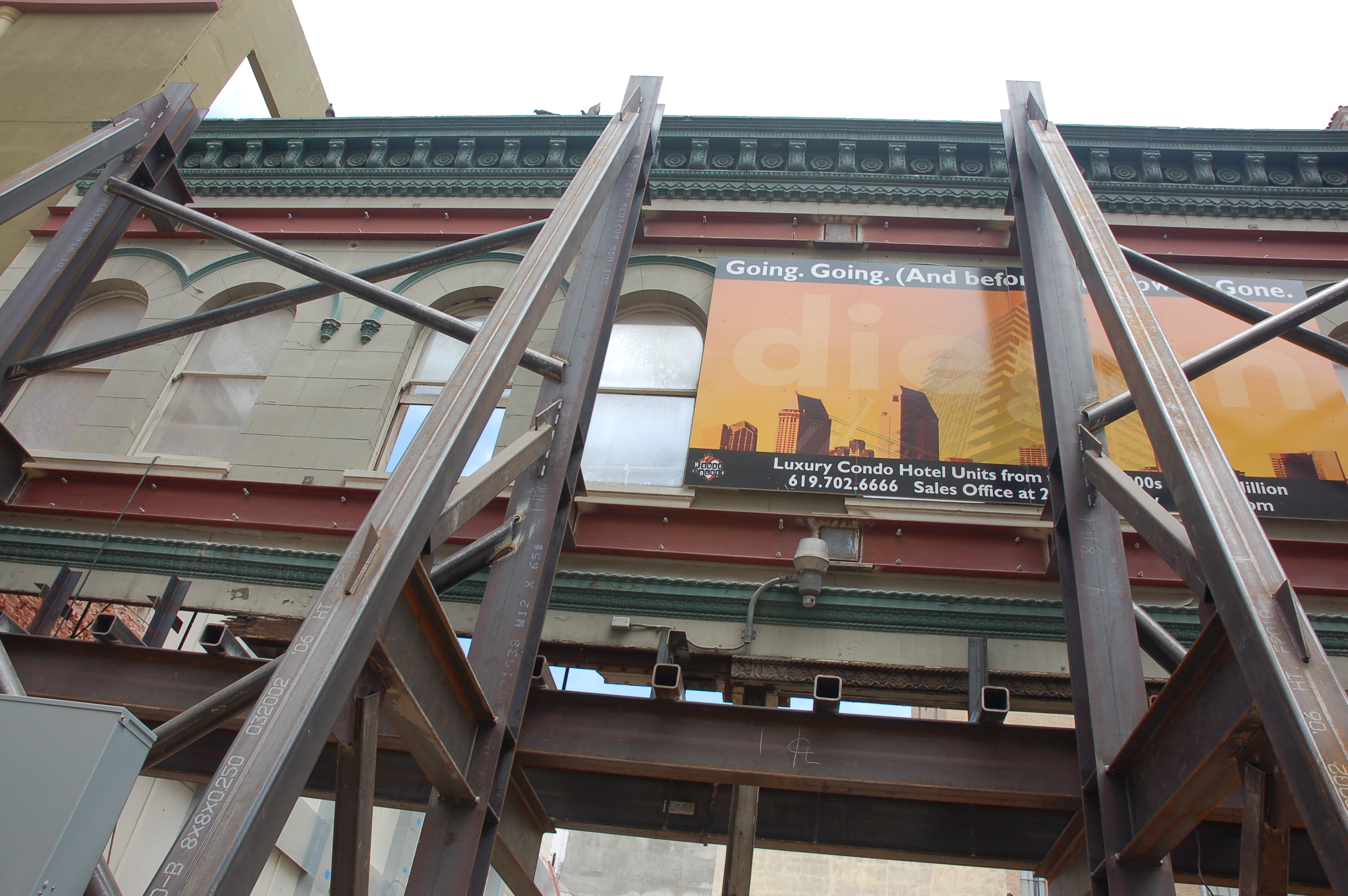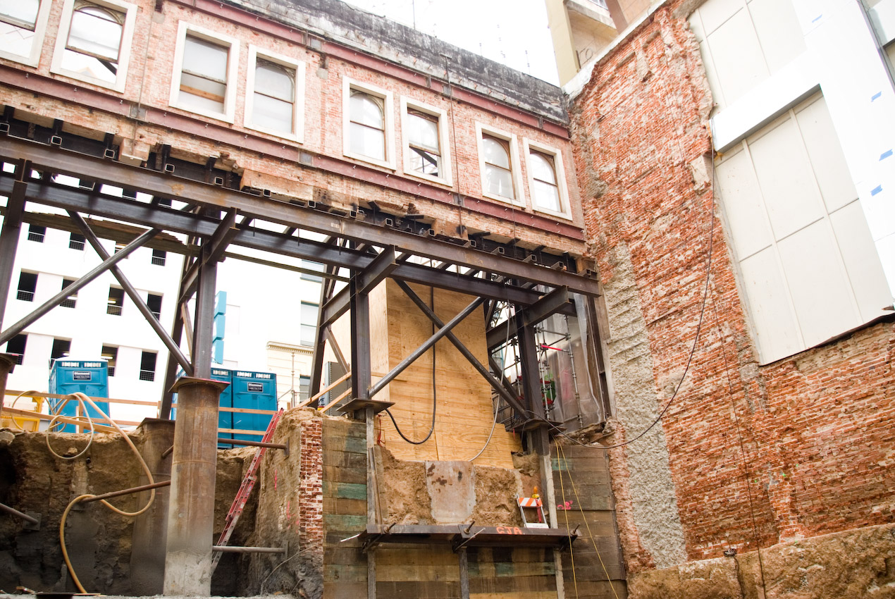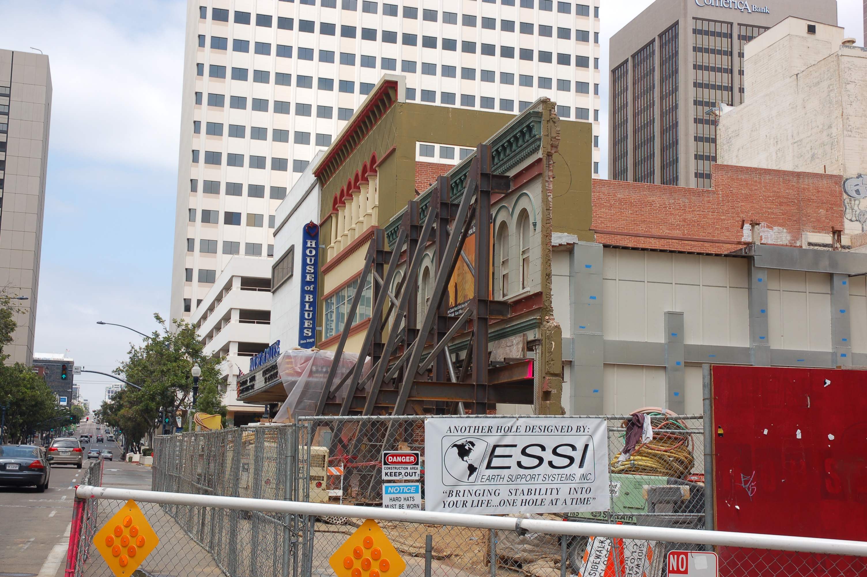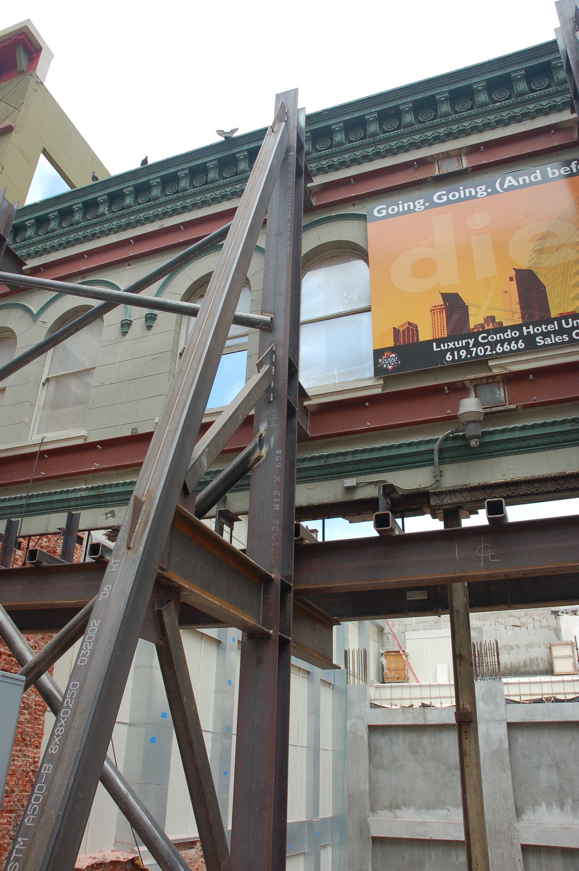Since it opened in 1962, Malcolm Drilling Company has become one of the largest and most successful foundation contractors in the world. Headquartered in San Francisco, MDC has developed specialized and proprietary techniques that have enabled them to handle difficult earth support systems that require innovative design/build techniques. Jack White, superintendent of MDC’s San Diego office, has worked with Will Fischetti, founder of Earth Support Systems, for over ten years on numerous projects, including the Marriott Residence Inn project in San Diego in 2007. White contacted Fischetti to design the shoring and façade support plans. The Marriott Residence Inn was being built adjacent to the historic Diegan Hotel, a hundred-year-old landmark building. Because of the age of the Diegan Hotel, the building had a sub-standard foundation which needed to be supported with underpinning while the hole was being dug for the Marriott.